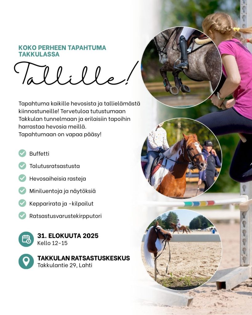 Järjestämme koko perheen Tallille! -tapahtumapäivän SRL:n innoittamana. Tervetuloa tutustumaan Takkulan tallin tunnelmaan ja katsomaan, mitä kaikkea voit harrastaa meillä hevosten kanssa.